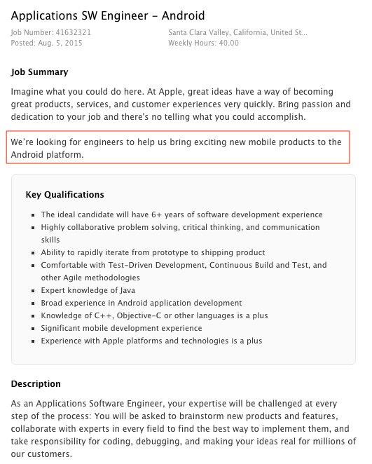 شركة آبل كشفت نيتها في تقديم تطبيقات أندرويد من خلال عرض توظيف على موقعها الرسمي خلال اليومين الماضيين تشير فيه بصراحة رغبتها في توظيف مهندسيين من أجل تطوير" منتجات مثيرة خاصة بالأجهزة المحمولة على منصة أندرويد" و هو ما يؤكد وجود مشاريع حقيقية في رفوف آبل خاصة بهذا النظام.
